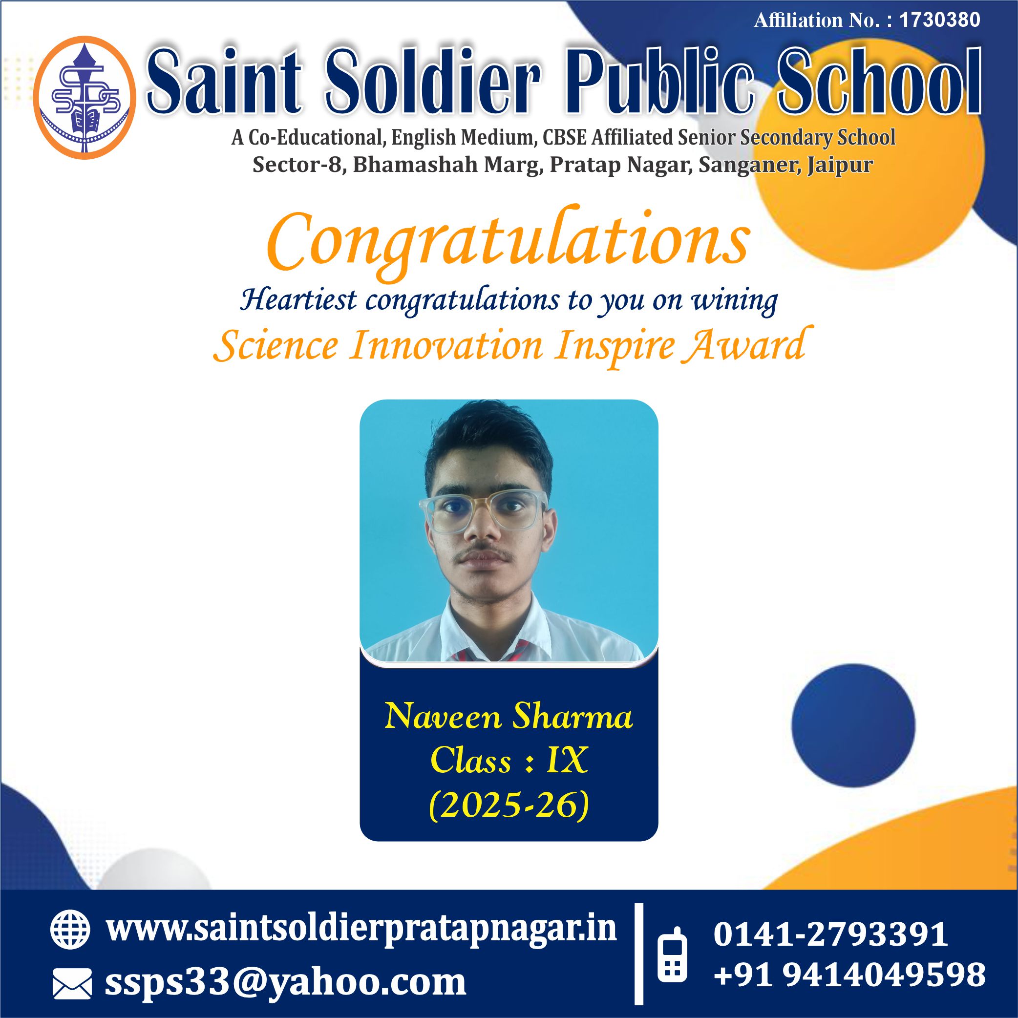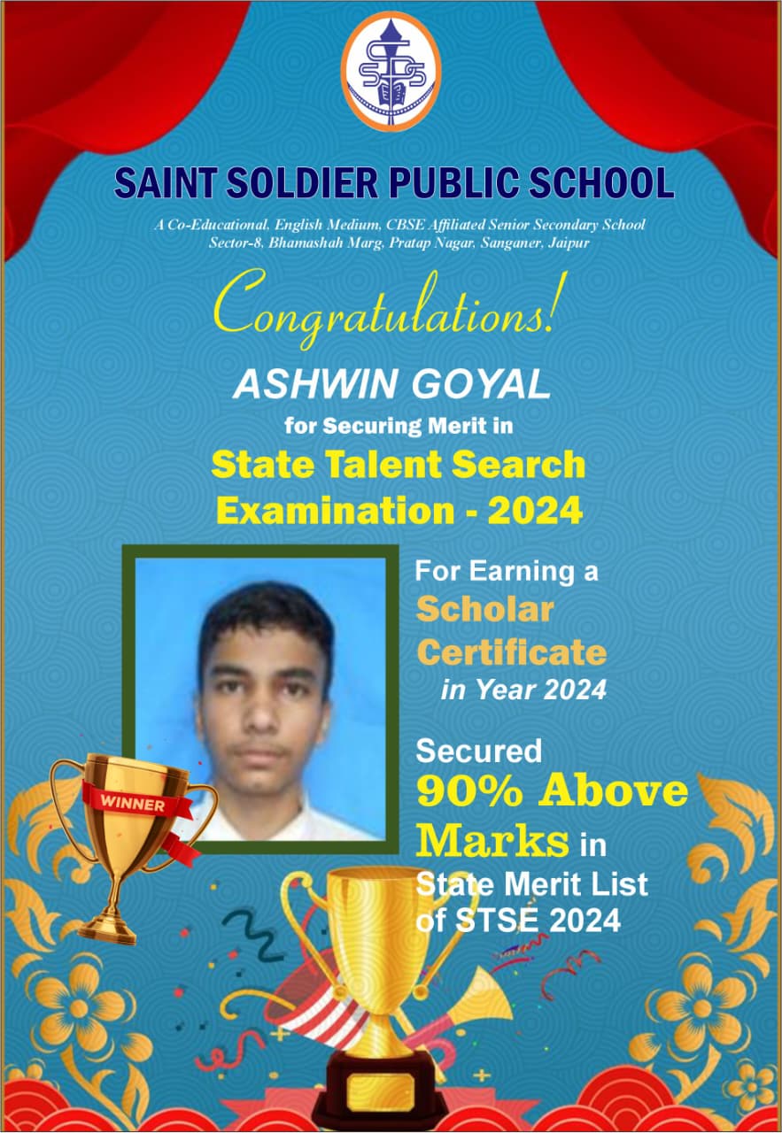 Congratulations!!! Mst. ASHWIN GOYAL for Securing Merit in State Talent Search Examination 2024